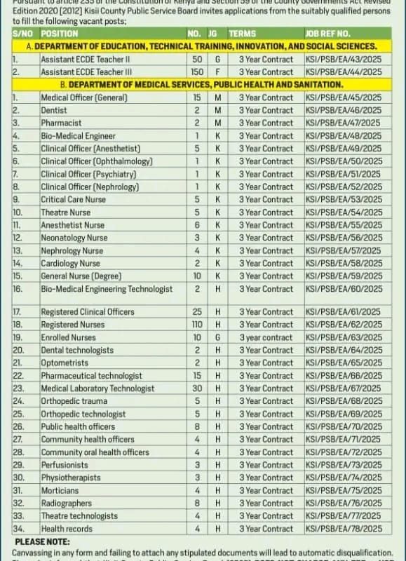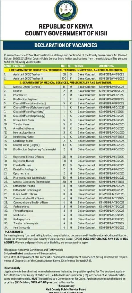 Pursuant to Article 235 of the Constitution of Kenya and Section 59 of the County Governments Act, the Kisii County Public Service Board invites applications from suitably qualified persons to fill the following vacant posts. All positions are on a 3-Year Contract basis.