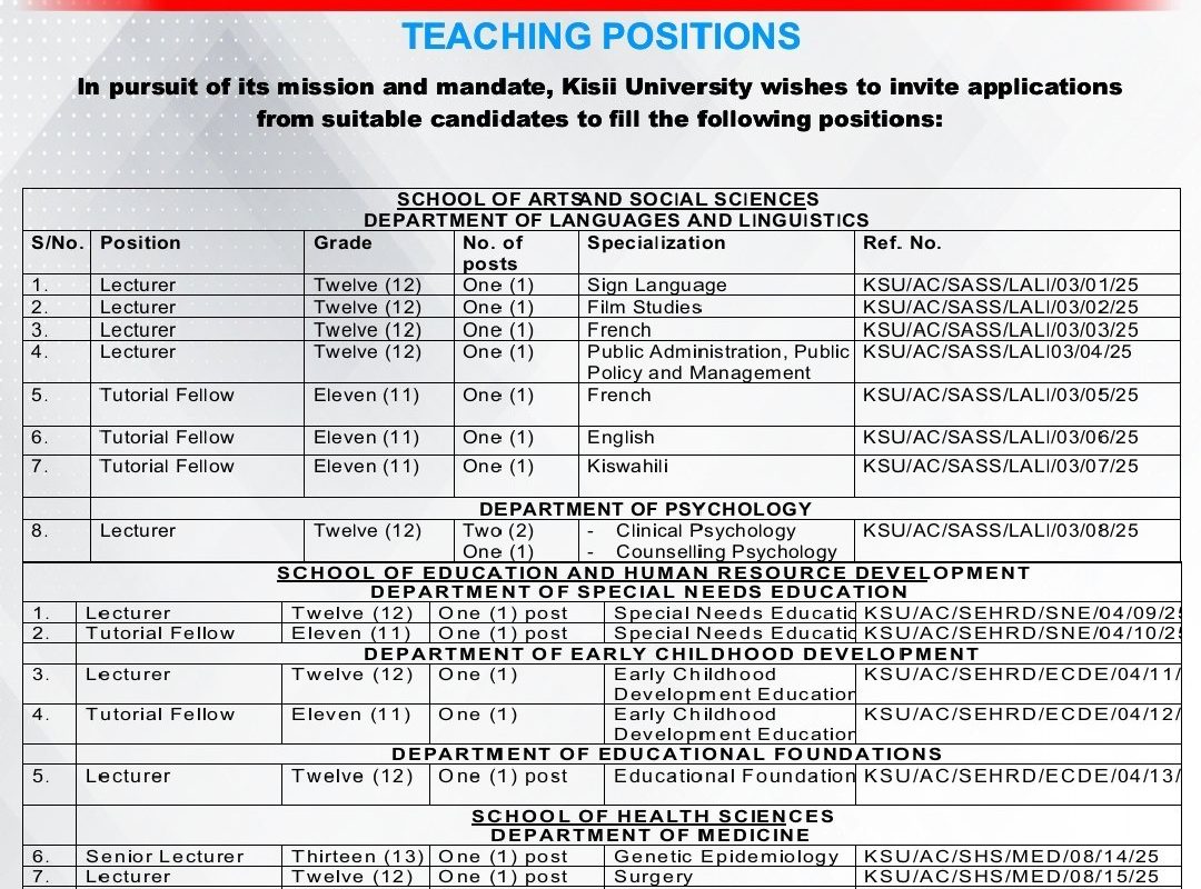 Detailed job descriptions, qualifications, and application procedures can be found on the Kisii University official website or the university’s job portal.